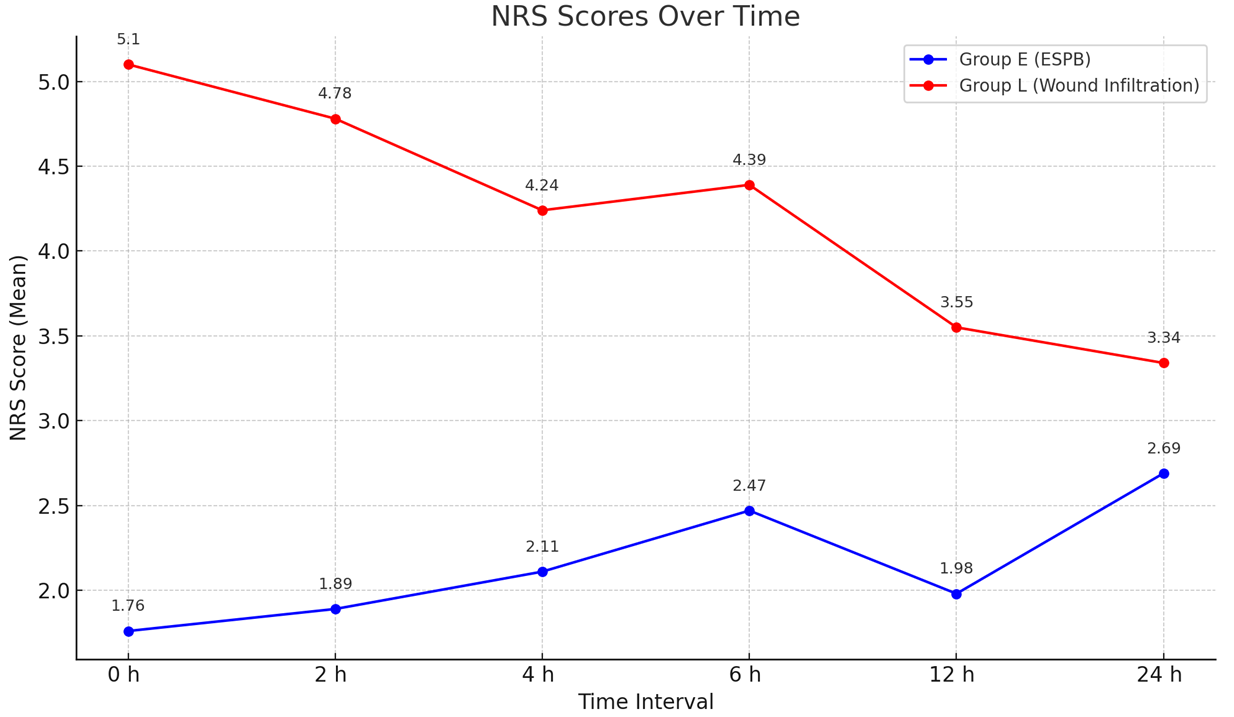 Table 3 and fig. 1 show notably reduced NRS pain scores in Group E at every measured time point—for instance, at 2 h: 1.89±0.79 compared to 4.78±1.17 (p<0.05), indicating enhanced analgesia from ESPB.