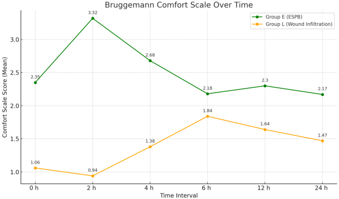 The ESPB group also showed a significantly higher level of patient comfort, evaluated through the Bruggemann Comfort Scale (BCS). At the 2-hour mark, Group E indicated a mean BCS of 3.32±1.01 compared to 0.94±0.63 in Group l (p<0.05). This pattern persisted across all assessed time points, suggesting that individuals in Group E attained greater comfort levels during the postoperative phase. Wang et al. [11] in 2021, evaluated postoperative comfort utilizing the Bruggemann Comfort Scale and found that ESPB consistently yielded higher BCS scores than TLIP and control groups from 6 to 48 h after surgery. This supports our results, as Group E (ESPB) indicated notably greater BCS scores at each time point with statistical significance of p-value of less than 0.05.
