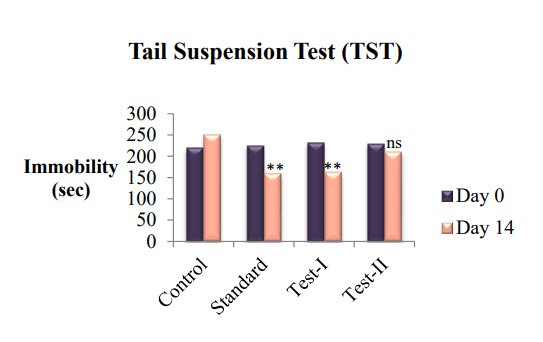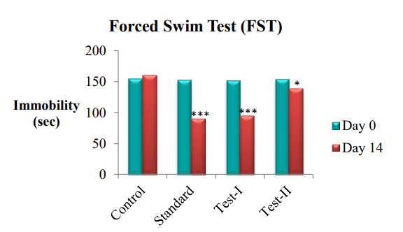 In the present study, all the animals of different groups were treated for 7 d. The changes in immobility duration were studied after administrating drugs in separate groups of animals. The immobility parameter was recorded after 24 h and after 14 d. The duration of immobility significantly increased (P<0.05) in control group compared with the treatment groups. All the treatment groups showed significant decrease in the decrease in duration of immobility, when compared with control group. The test group-I showed highly effective results and it was near to the standard group.
