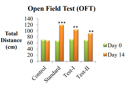The total distance was recorded after 24 h and after 14 d in all the groups. Treatment and imipramine treated mice showed significant increase (P<0.05) in the number of rearings and number of squares crossed (P<0.01) as compared to control groups. Test group-I showed significant increase in the number of rearings (P<0.05) and number of squares crossed (P<0.01) near to the standard group. Additionally, Test group-II also showed increased number of rearings and square crossed as compared to control group.