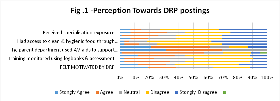 Results: Data analysis was carried out using Microsoft Excel. Among the second-year and third-year postgraduates, 55% and 56% were male, while 45% and 44% were female, respectively. The overall perception and attitude of the students revealed that the majority held a neutral opinion regarding the DRP postings.