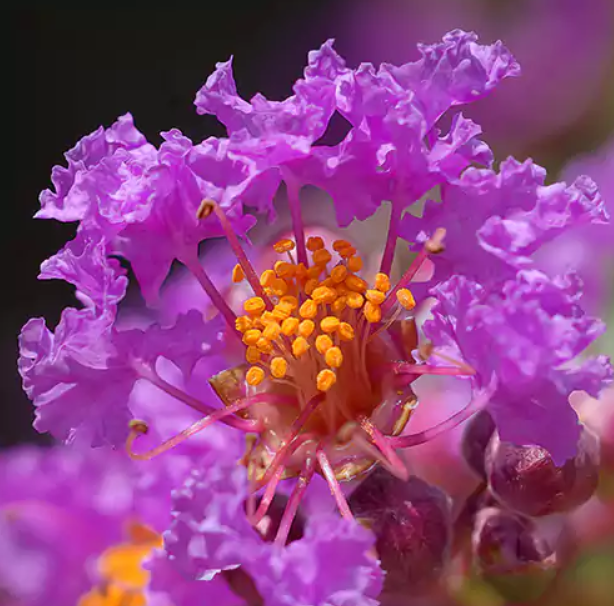 The phytochemical analysis of the fruit and leaves of Lagerstroemia speciosa showed that they included α-amino acids, phenolic compounds, glycosides, terpenoids, steroids, reducing sugars, tannins, organic acids, flavonoids, starch, alkaloids, carbohydrates, and saponins, among many other active metabolites. The medium-to-large evergreen Lagerstroemia speciosa tree can reach a height of 25 m. The leaves measure 10–20 cm by 5-7.5 cm, are leathery, oblong to oval in form, and have a short petiole on the glabrous. The flowers are in a big terminal panicle that is regular in shape, 5.0–7.5 cm broad, and ranges in color from pink to purple. With six leathery sepal lobes and six lilac purple petals up to 3.5 cm long with wavy borders, the calyx is a green ribbed tube with short claws connecting the sepals. There are many stamens with golden-yellow anthers and purple filaments. The pistil is uncomplicated, featuring a superior ovary, a dark green stigma, and a long purple style up to 5 cm long [20].