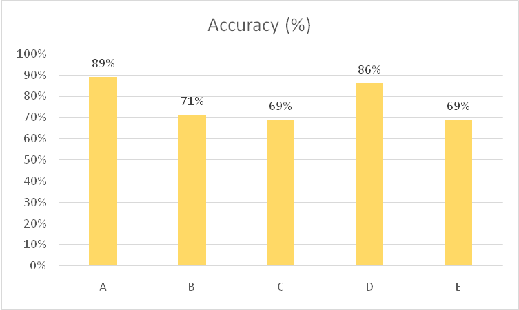 Fig. 1 presents the overall accuracy of the chatbots in solving 35 pharmaceutical calculation questions. Chatbot A achieved the highest accuracy (89%), followed closely by Chatbot D (86%). Chatbots B, C, and E showed moderate performance, with accuracies of 71%, 69%, and 69%, respectively.