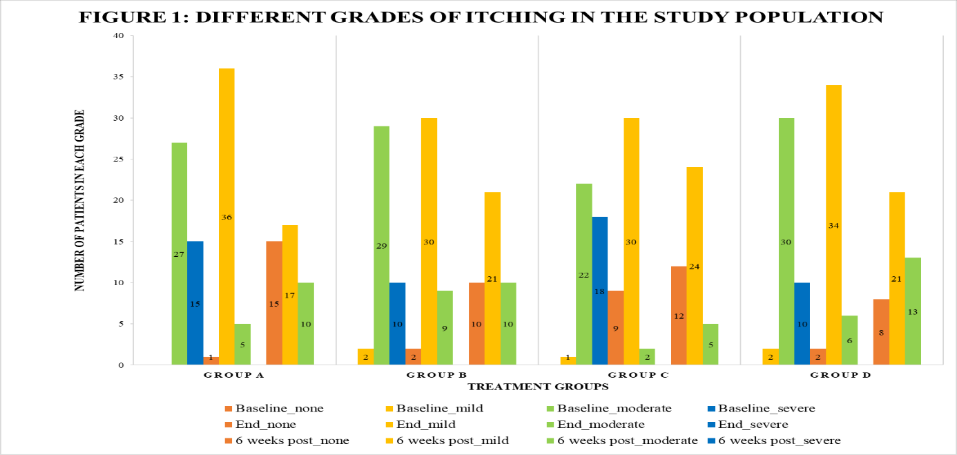 Itching severity improved significantly in all groups from baseline to end of treatment and at 6-week follow-up (p<0.001). Initially, all patients had moderate to severe itching. By treatment end, most improved to none/mild—highest in Group C (95.12%), with complete relief in 21.95% (p = 0.0003). At 6 w post-treatment, itching was absent in 35.7% (A), 24.4% (B), 29.3% (C), and 19% (D), with no severe cases. Recurrence of moderate itching was lowest in Group C (12.2%) and highest in Group D (31%). Intergroup differences were not significant (p>0.05), but Group C showed the best long-term control. Fig. 1 illustrates itching grades across time points.