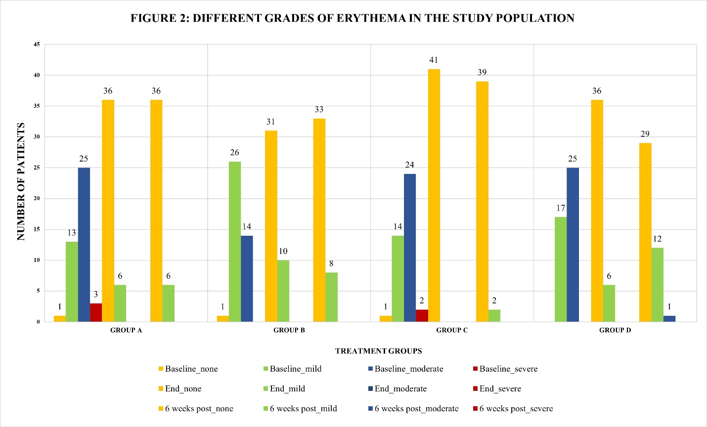 Erythema significantly improved in all groups from baseline to end of treatment and at 6-week follow-up (p<0.001). At baseline,>92% in each group had mild to severe erythema. Complete resolution at treatment end was highest in Group C (100%, p = 0.0037), followed by Groups A and D (85.7%), and B (75.6%). At 6 w post-treatment, erythema was absent in 95.1% (C), 85.7% (A), 80.5% (B), and 69% (D), with mild recurrence lowest in Group C (4.9%) and highest in D (28.6%). No severe cases recurred. While baseline intergroup differences were significant (p = 0.028), they were not at treatment end or follow-up, indicating all regimens were effective, with Group C showing the most sustained benefit. Fig. 2 illustrates erythema grades across time points.