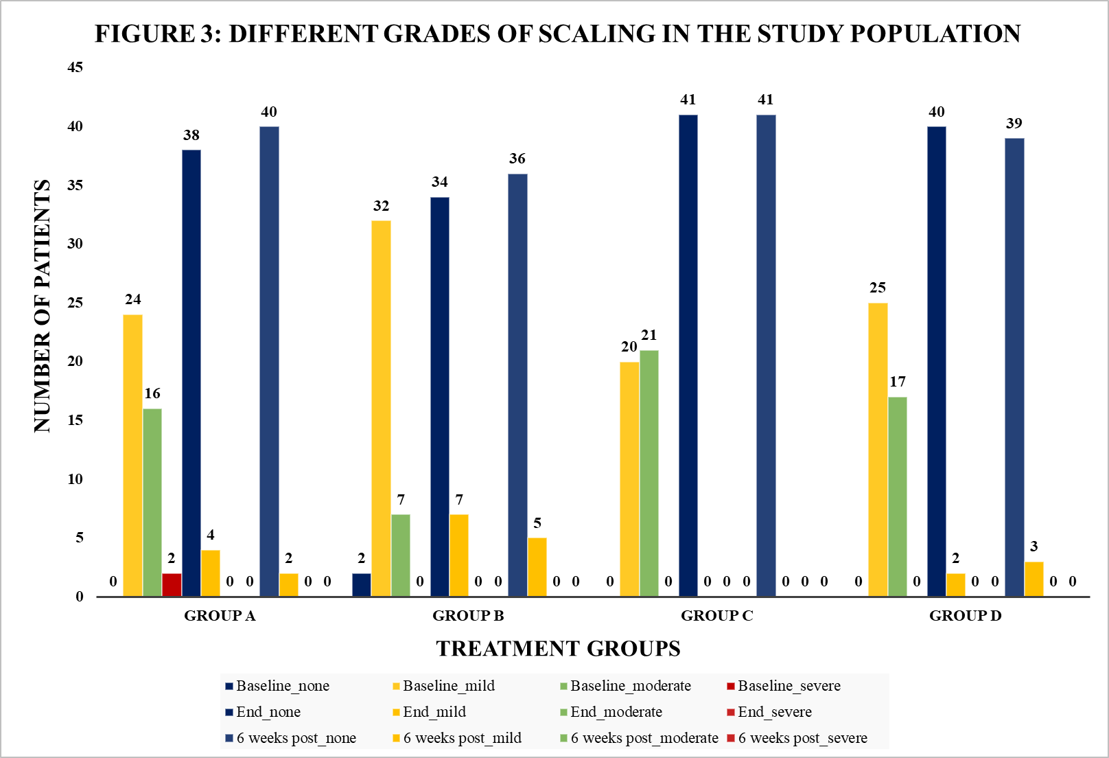 Scaling severity improved significantly in all groups from baseline to treatment end and 6-week follow-up (p<0.001). At baseline, nearly all patients had mild to severe scaling. By treatment end, resolution was highest in Group C (100%), followed by D (95.2%), A (90.5%), and B (82.9%). At 6 w post-treatment, absence of scaling persisted in Group C (100%), with mild recurrence in A (4.8%), B (12.2%), and D (7.1%); no moderate/severe recurrence occurred. While baseline intergroup differences were significant (p = 0.024), they were not at treatment end (p = 0.583) or follow-up (p = 0.814), confirming comparable efficacy. Group C (Itraconazole 100 mg BD for 4 w) showed the most sustained improvement (p = 0.028). Fig. 3 illustrates scaling grades across time points.