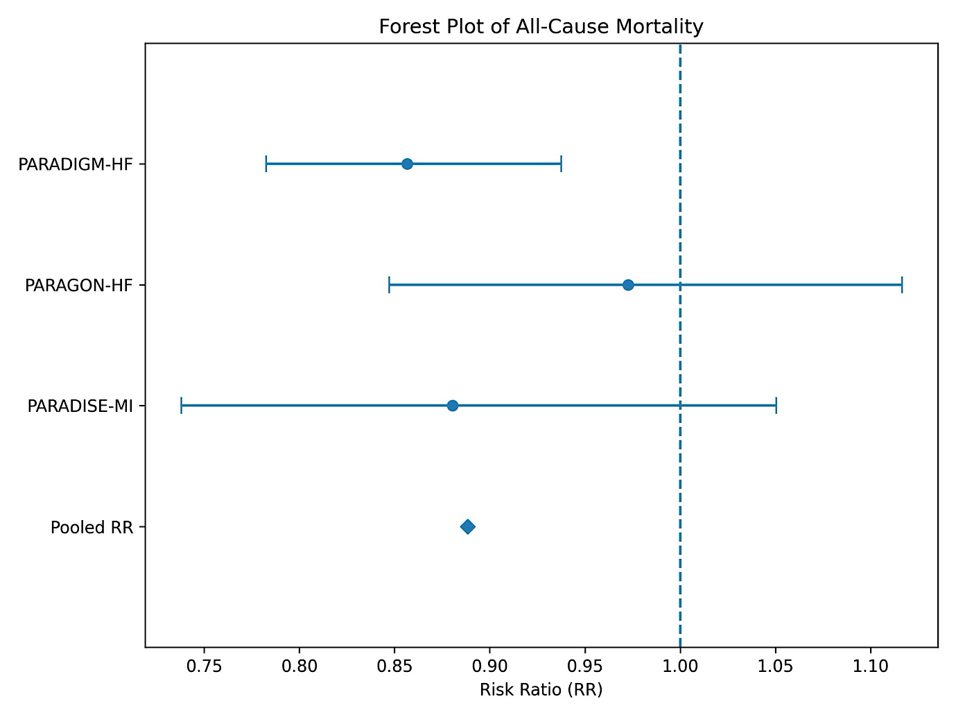 Results: Three randomized controlled trials comprising more than 18,000 participants met the inclusion criteria. Sacubitril/valsartan was associated with a statistically significant reduction in all-cause mortality compared with ACE inhibitors or ARBs (pooled RR = 0.89; 95% CI: 0.83–0.95). Statistical heterogeneity was low (I² = 12.7%). The observed mortality benefit was largely driven by trials enrolling patients with reduced ejection fraction.
