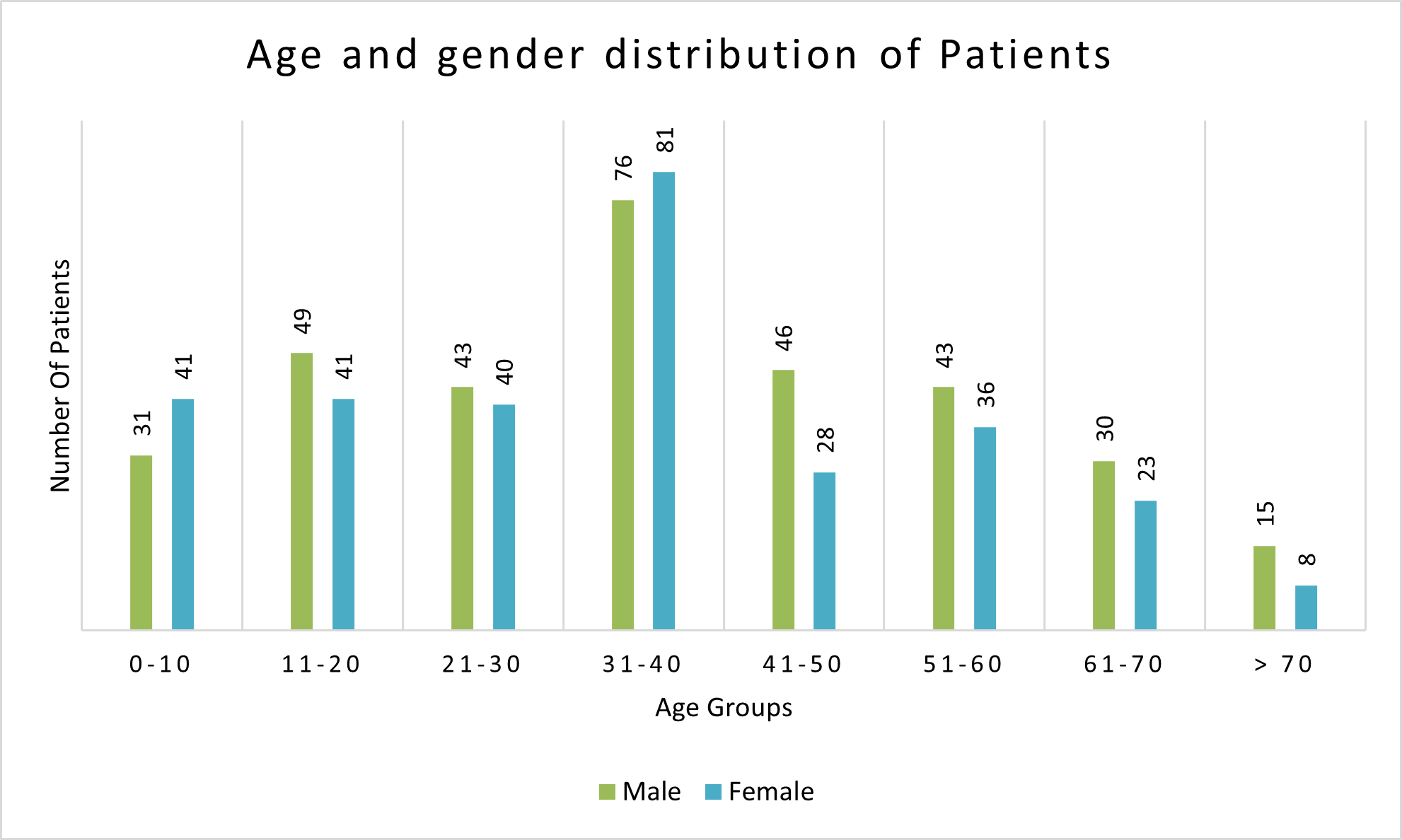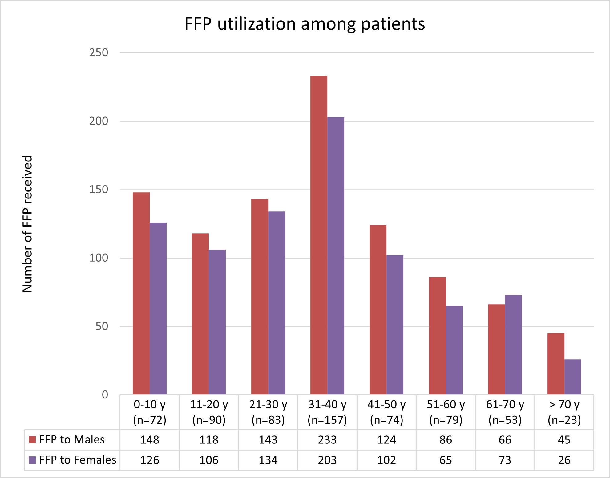 Fig. 1: Age and gender distribution of patients who had received FFP transfusion (age group in years and gender in numbers)