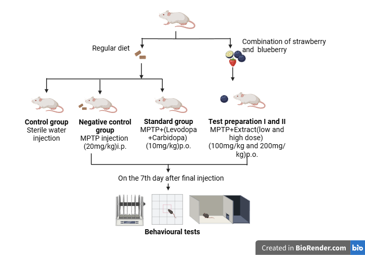 In this context, the present study aims to investigate the neuroprotective potential of ethanolic extracts of strawberry and blueberry in an MPTP-induced mouse model of Parkinsonism. MPTP (1-methyl-4-phenyl-1,2,3,6-tetrahydropyridine) is a well-established neurotoxin that selectively targets dopaminergic neurons and replicates key features of human PD in animal models. By evaluating behavioural parameters such as motor coordination, locomotor activity, anxiety-like behaviour, and catalepsy, this study seeks to explore whether these fruit extracts can mitigate PD-like symptoms and provide a basis for their possible therapeutic use in the management of Parkinson’s disease.