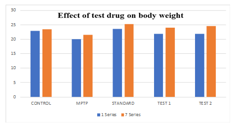 In both test groups, mice of 6 no. in each group Treated with Ethanolic extract of Fruit of Strawberry and Blueberry (100 and 200 mg/kg/p. o.), respectively showed significant (p<0.05) increase in body weight as compared to the control group. Treatment with SYNDOPA (10 mg/kg p. o.) the body weight significantly increased as compared to the normal group.