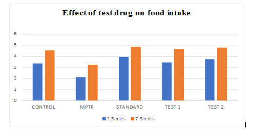 The mice of Ethanolic extract of Fruit of Strawberry and Blueberry (100and200 mg/kg/p. o.) treated group showed a significant (p<0.05) increase in feed intake as compared to the control group. In treatment with SYNDOPA (10 mg/kg p. o.), the feed intake significantly (p<0.05) increased as compared to the control group.