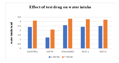 The mice of Ethanolic extract of Fruit of Strawberry and Blueberry (100 and 200 mg/kg/p. o) treated group showed a significant (p<0.05) increase in body water intake as compared to the control group. In treatment with SYNDOPA (10 mg/kg p. o.), the water intake significantly (p<0.05) increased as compared to the test group.
