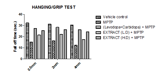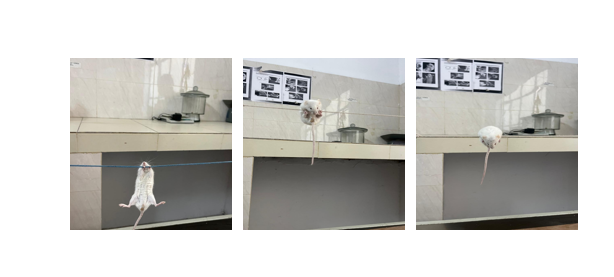 The Bar test has been used to evaluate motor coordination by testing the ability of mice to remain on the rod Deacon, (2013). The bars are made of brass, 38 cm long, held 49 cm above the bench surface by a wooden support column at each end. The columns are secured to a heavy wooden base. Three bar/wire diameters are available: 0.5, 2, and 4 mm. larger diameter bars have been included to refine the test, as mice cannot grip these so well. The experiment was performed as described by Deacon (2013), with some modifications to evaluate fore and hind limb motor coordination. The mouse was lifted by the tail and placed on the bench in front of the apparatus. The mouse was slid backward quickly about 20 cm (aligning it perpendicular to the bar), rapidly raised, and allowed to grasp the horizontal bar at the central point with its forepaws only. The tail was released, and the stopwatch was started simultaneously. Some mice may fail to grip better if the tail is released suddenly. If the mouse failed to grasp the bar properly the first time, the experiment was performed again after a brief rest and repeated a maximum of 3 attempts. The best score was taken. The scoring system for 0.5, 2 mm, and 4 mm bars was the same throughout the protocol, and the final score was recorded [16].