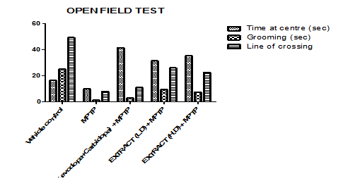 The open field test was conducted to assess locomotor behaviour by measuring the time spent in the center, grooming duration, and the number of line crossings. Group III spent the most time in the center, while Group II spent the least. Group I remained in the center longer than Group II, whereas Groups III, IV, and V spent more time in the center than both Groups I and II. Among them, Group III had the longest duration, followed by Group V, then Group IV.