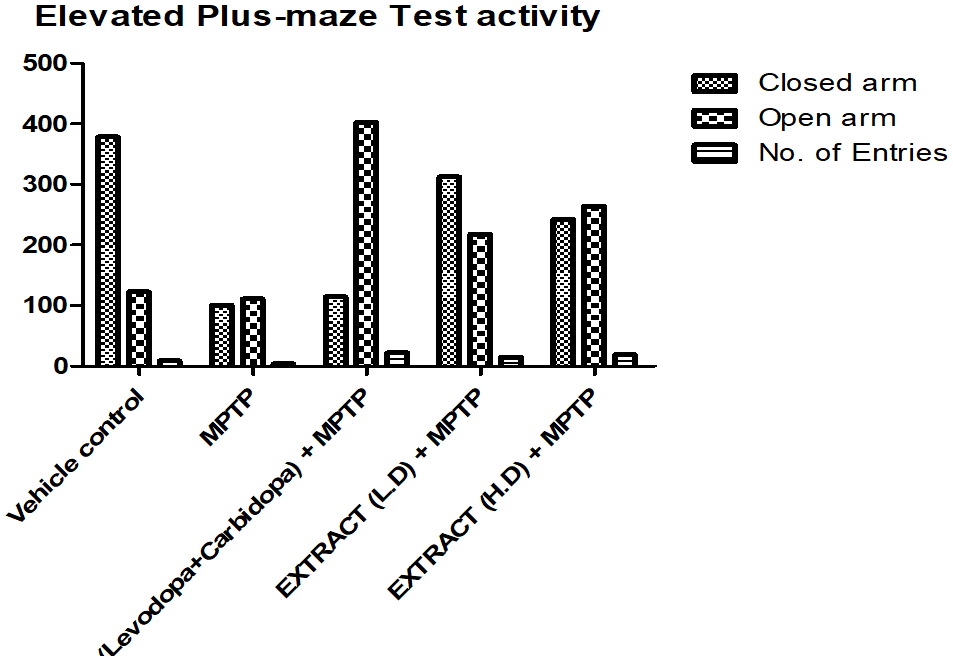 The elevated plus maze test was conducted to assess anxiety-like behaviour by measuring the number of entries and the time spent in open and closed arms. Group I spent the most time in the closed arm, indicating the highest anxiety-like behaviour, while Group II spent the least time in the closed arm, suggesting the lowest anxiety-like behaviour. Groups III, IV, and V spent less time in the closed arm than Group I but more than Group II. Among them, Group IV remained in the closed arm the longest, followed by Group V, while Group III spent the least time there.