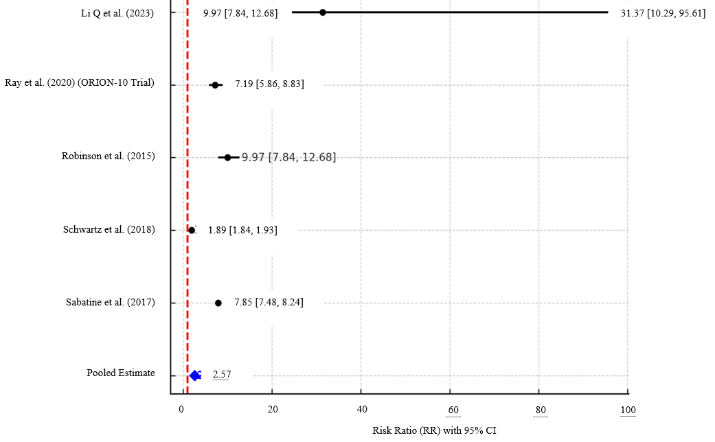 This meta-analysis combined data from five rigorously conducted randomised controlled trials (RCTs) to evaluate the efficacy of PCSK9 inhibitors, added to stable statin therapy with or without ezetimibe, in achieving clinically relevant LDL-C targets (<1.8 mmol/l or ≥50% reduction from baseline). The pooled analysis demonstrated a robust and statistically significant benefit, with a pooled risk ratio (RR) of 2.57 (95% CI: 2.52–2.63). This indicates that patients treated with PCSK9 inhibitors were more than twice as likely to reach LDL-C goals compared with placebo. These findings closely parallel results from major cardiovascular outcome trials, such as Fourier (evolocumab) and Odyssey Outcomes (alirocumab), which also reported high target attainment rates and marked LDL-C reductions when PCSK9 inhibitors were added to maximally tolerated statins [11, 12].