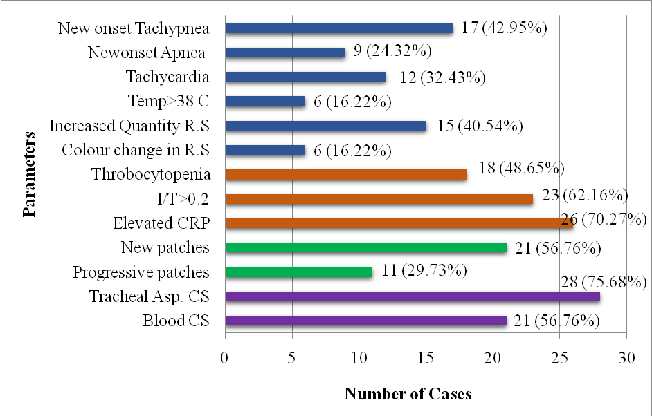 Among 37 VAP cases, new onset tachypnea (45.95%) and increased respiratory secretions (40.54%) were the most common clinical signs, followed by tachycardia (32.43%) and new onset apnea (24.32%), Both increased temperature and color changes in respiratory secretions (R. S) were observed in 16.22% of cases. Lab results frequently showed elevated C-reactive protein (70.27%), an I/T ratio>0.2 (62.16%), and thrombocytopenia (48.65%). Radiologically, new patches on X-rays (56.76%) were typical, with progressive patches in 29.73%. Microbiologically, tracheal aspirate cultures were positive in 75.68%, and blood cultures (CS) in 56.76% of VAP patients (fig. 1).