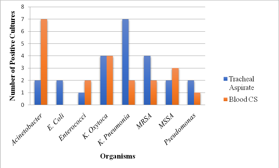 Fig. 2: Distribution of bacterial isolates from tracheal aspirate and blood cultures in neonates with VAP