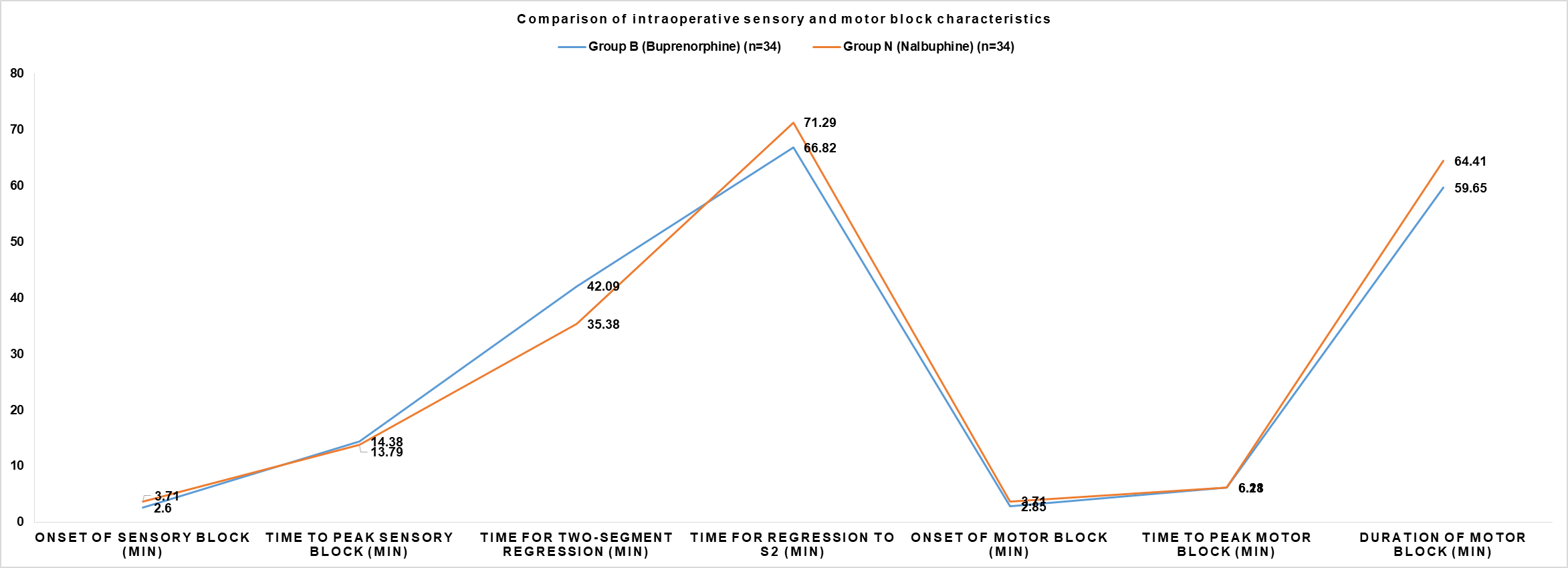 Fig. 1: Comparison of intraoperative sensory and motor block characteristics between buprenorphine and nalbuphine groups