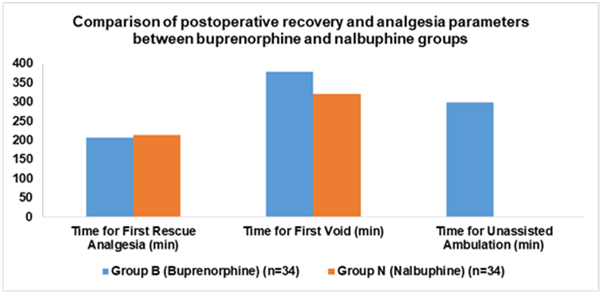 Fig. 2: Comparison of postoperative recovery and analgesia parameters between buprenorphine and nalbuphine groups