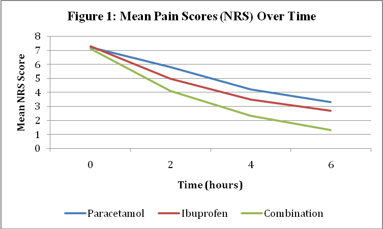 Analysis of variance (ANOVA) revealed statistically significant intergroup differences at 4 and 6 h (p<0.01), indicating higher efficacy of combination therapy mean percentage reduction in NRS scores from baseline to 6 h was 45.8% for paracetamol, 58.9% for ibuprofen, and 81.7% for combination therapy.