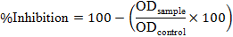 The anti-inflammatory potential of the nanoemulgel formulations was evaluated using a protein denaturation method, with bovine serum albumin (BSA) as the protein model. A 5% w/v bovine serum albumin (BSA) solution was prepared in phosphate buffer (pH 6.3). The test formulations were diluted to 100–500 μg/ml, and a marketed indomethacin gel (Inmecin 1%, 100 μg/ml) was used as the reference standard. The percentage inhibition of protein denaturation was calculated as follows: