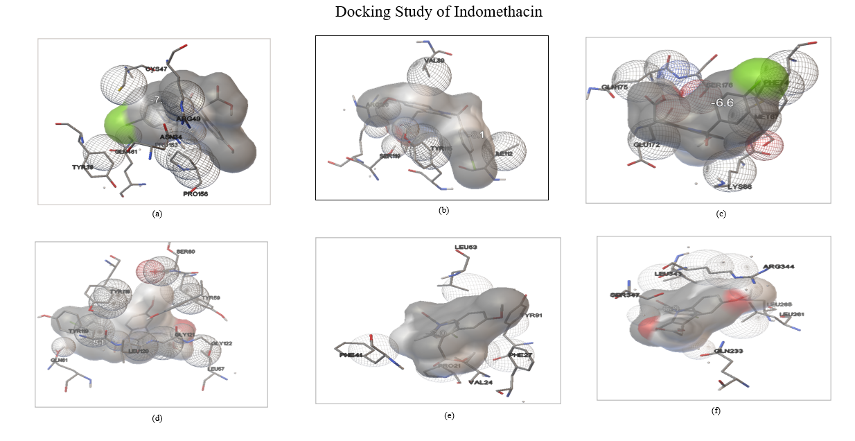 Fig. 11: Docking study of Indomethacin with (a) COX1; (b) COX2; (c) IL 6 (d) TNF Alpha; (e) Phospholipase A2; (f) Phospholipase D2