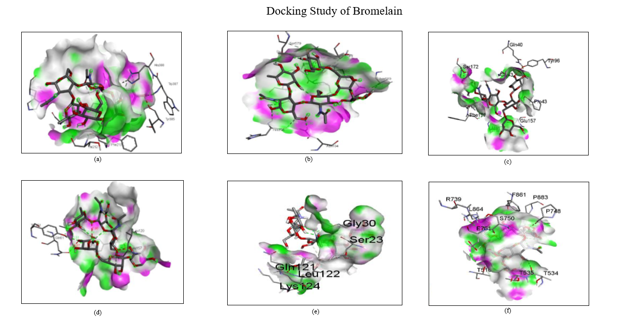 Fig. 12: Docking study of Bromelain with (a) COX1; (b) COX2; (c) IL 6 (d) TNF Alpha; (e) Phospholipase A2; (f) Phospholipase D2