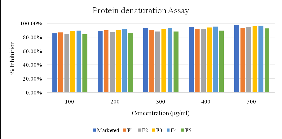 All formulations showed concentration-dependent inhibition of protein denaturation. F4 exhibited the highest inhibition (96.51% at 500 μg/ml), comparable to the marketed gel (97.23%).