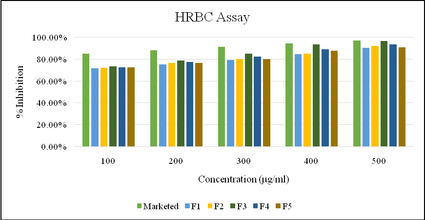 The formulations also showed concentration-dependent membrane stabilization. F3 (96.49% at 500 μg/ml) was most effective, approaching the marketed formulation (97.11%).