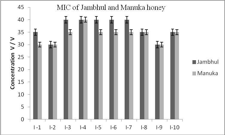 Results: MIC was found to be in the range of 30%-40% (v/v) for both honey. The average MIC of Manuka for all the 10 isolates was estimated to be 34% whereas that of Jambhul, was 36.5% and this difference was found to be statistically insignificant (P>0.05 t test). Total phenolic content (TPC) in Manuka and Jambhul honey was estimated using Folin’s Ciocalteau method and was found to be 1.22 mg TA/gm in Manuka honey and 1.18 mg TA/gm in Jambhul honey.