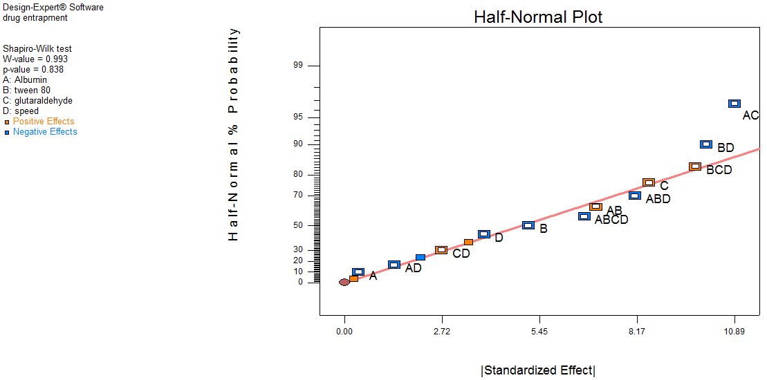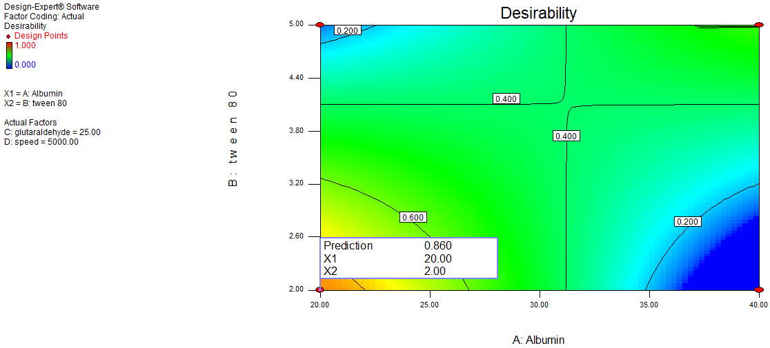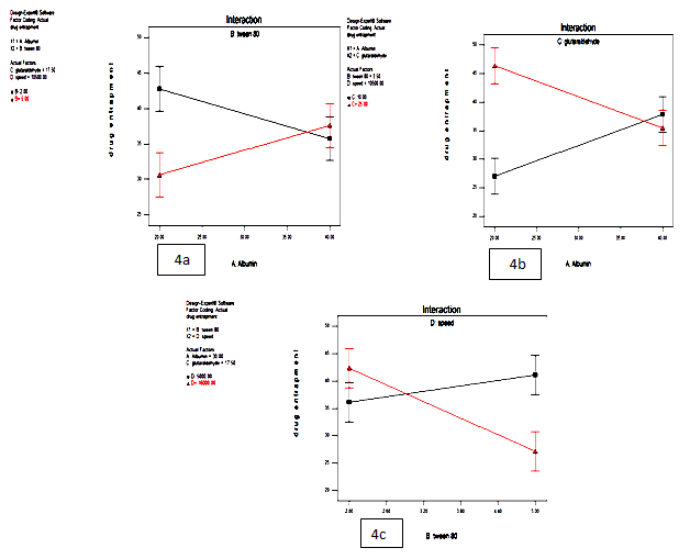 Design Expert software 8.0.6.1. then evaluate the effects of variables that were plotted in some diagrams. In each plot, two factors remained constant and the other factor was in the given range between its high and low levels; therefore, its influence can be seen as a line that represented the demanded response. The entrapment efficiency increases with decreasing the Tween 80 concentration and speed when A and C are in its medium amount. And the entrapment efficiency increases with increasing the GTA concentration A and C are in its medium amount and D is in its lowest level as shown in fig. 3. Effects of the interactions were plotted in diagrams in that one factor was plotted against the entrapment efficiency and the second variable remained constant. Here were two lines that the red one represented high level of this variable and the black one was referred to the low level. Fig. 4 shows the interaction effect. Interaction of AC and BD has negative significant effect and AB have positive significant effect on entrapment efficiency.