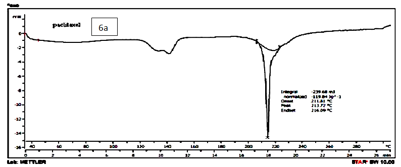 The thermal properties of PTX, BSA, and PTX-loaded BSA nanoparticles were investigated by Differential Scanning Calorimetry (DSC). Samples (3-5 mg) were sealed in aluminum pans with lids and heated in a rate of 10 ̊C/min using dry nitrogen as carrier gas with a flow rate of 25 ml/min. The heat flow being recorded from 30 to 400˚C. Indium was used as the standard reference material to calibrate the temperature and energy scales of the DSC instrument (Mettler TIodo by Zurich Switzerland) [20, 23, 27].