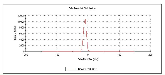 The zeta potential is the electrostatic potential that exists at the shear plane of a particle, which is related to both the surface charge and the local environment of the particle. Zeta potential for optimized batch was determined and it was found–10.4 mV, showed in fig. 7 which indicates moderate stability with no agglomeration. The negative surface charge originates from free carboxylic acid groups at the chain ends of the BSA polymer. The possible effects of surface charge may affect the in-vivo life span of the natural drug delivery system.