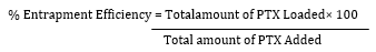 Nanoparticles equivalent to 3 mg of PTX were dissolved in 10 ml of methanol in 100 ml volumetric flasks and then make up the volume with water. Then sonicate it for 15 min. Absorbance was measured by a UV spectrophotometer (Jasco V 600, Japan) at 227 nm. The % entrapment efficiency was calculated from following formula [21, 22].