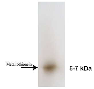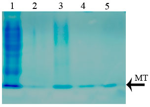 Purified MT protein was confirmed by Western blot with specific antibodies. The antibody shows a positive cross reactivity with MT proteins (fig. 2). Purified MT protein was detected using chemiluminescence system (ECL Kit) method. MT bands appeared in the PVDF membrane, which proves that antibody, reacted with specific MT protein after electrophoresis in 12% SDS-PAGE.