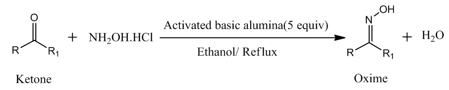 Conclusion: Here preparation of oxime in a mild basic medium has been reported. Alumina (Al2O3) is pretty cheap and not mentionable hazardous and it has been used here for the first time in synthesis of oxime.