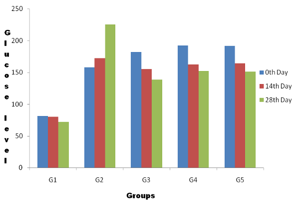 G1-Normal Control; G2-Diabetic Control; G3-Positive control (Glipizide); G4-Treatment group 200 mg/kg; G5-Treatment group 400 mg/kg.