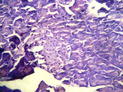 Fig. 11: The numbers of islets cells were moderately decreased, islets cells were moderately swelled