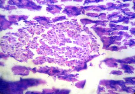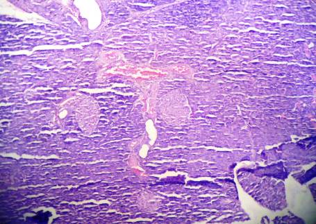Fig. 10: The numbers of islets cells were mildly decreased, islets cells were mildly swelled