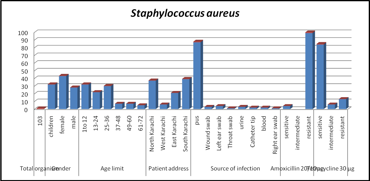Among 103 samples of Staphylococcus aureus 4(3.9%) sample showed sensitivity, no clinical isolates showed intermediate response and 99 (96.1%) sample exhibited resistance against amoxicillin while, 84 (81.6%) sample of Staphylococcus aureus were sensitive against tetracycline, 6(5.8%) showed intermediate response and 13 (12.6%) were resistant to the tetracycline 30 µg. 32 (31.1%) samples were collected from children, 43(41.7%) from female and 28 (27.2%) from the male patient. Clinical isolates collected according to the age, 32 samples collected from the age between 1-12 y, 22 from 13-24 y, 30 from 25-36 y, 7 from the age limit between 37-48 y,7 from 49-60 y and 5 sample were collected from the age of 61-72 y.