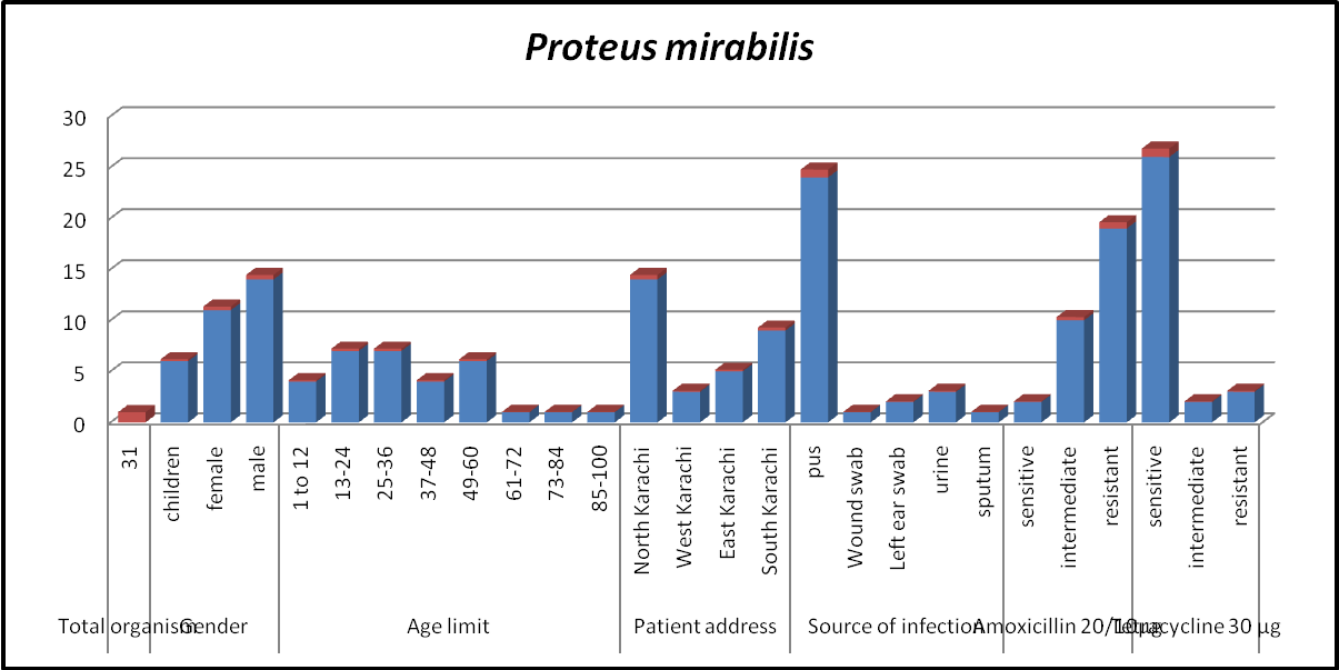 31 sample of Proteus mirabilis were collected from the different zones of Karachi, from north Karachi 14(45.2%) clinical isolates were collected, 3 (9.7%) from west, 9 (29.0%) from south and 5 from the east Karachi (6.1%).2 (6.5%) clinical isolates showed sensitivity towards Proteus mirabilis, 19 (61.31%) showed resistance and 10 (32.3%) showed intermediate resistance against amoxicillin. On the other hand, tetracycline showed 3(9.7 %) resistance against Proteus mirabilis, 26 (83.9%) showed sensitivity and 2 (6.5%) clinical isolates showed intermediate resistance. 6 (19.4%) clinical isolates were collected from children from female 11(35.5%) and from the male 14(45.2%) clinical isolates were collected. The clinical isolates collected from pus were 24(77.4%) from wound swab 1(3.2%), 2 (6.5%) from left ear swab, 3(9.7%) from urine and 1 (3.2%) from sputum. 4 (12.9%) clinical isolates were collected from the age between 1-12 y, 7 (22.6%) from 13-24 y, 7 (22.6%) from 25-36 y, 4 (12.9%) clinical isolates from the age between 37-48, 6 (19.4%) from the 49-60 age,1 (3.2%) from 61-72, 1(3.2%) from 73-84 age and 1 (3.2%) from the age between 85-100 y.