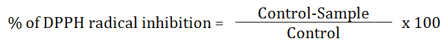 The antioxidant activity of methanol extract of leaves of H. auriculata was measured on the basis of the scavenging activity of the stable 1, 1-diphenyl 2-picrylhydrazyl (DPPH) free radical with slight modifications [9, 10]. One ml of 0.1 mM DPPH solution in methanol was mixed with 1 ml of various concentrations (10-70 μg/ml) of methanol extract of leaves of H. auriculata. The mixture was then allowed to stand for 30 min incubation in dark. Ascorbic acid was used as the reference standard. Mixer of 1 ml methanol and 1 ml DPPH solution was used as the control. The decrease in absorbance was measured using UV-Vis spectrophotometer at 517 nm. The percentage of inhibition was calculated using the following formula: