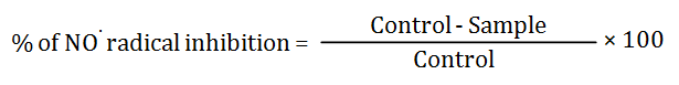 The procedure is based on the principle that, sodium nitroprusside in aqueous solution at physiological pH spontaneously generates nitric oxide which interacts with oxygen to produce nitrite ions that can be estimated using Griess reagent [13]. Scavengers of nitric oxide compete with oxygen, leading to reduced production of nitrite ions. For the experiment, 1 ml of sodium nitroprusside (10 mM), in phosphate-buffered saline was mixed with different concentrations (2-14 µg/ml) of methanol extract (1 ml) of leaves of H. auriculata and incubated at room temperature for 150 min. After the incubation period, 0.5 ml of Griess reagent [1% sulphanilamide, 2% o-phosphoric acid and 0.1% of N-(1-naphthyl) ethylenediamine dihydrochloride] were added. Ascorbic acid was used as positive control. The absorbance of the chromophore formed was read at 546 nm. The percentage of NO radical scavenging activity was calculated using the following formula: