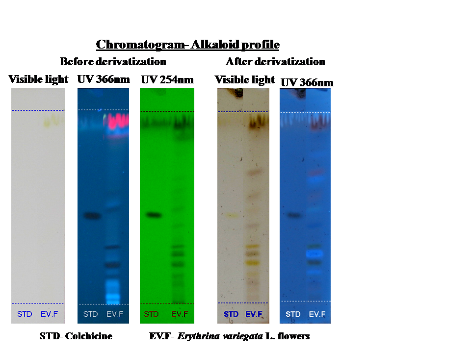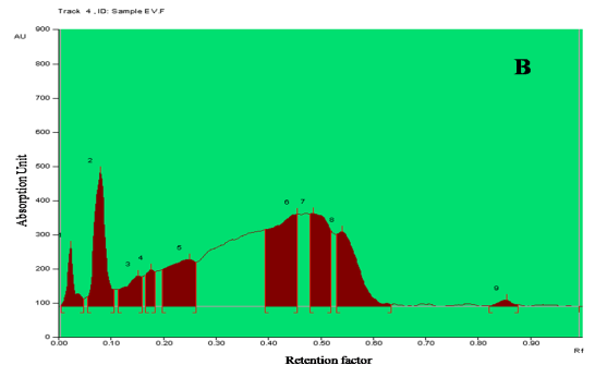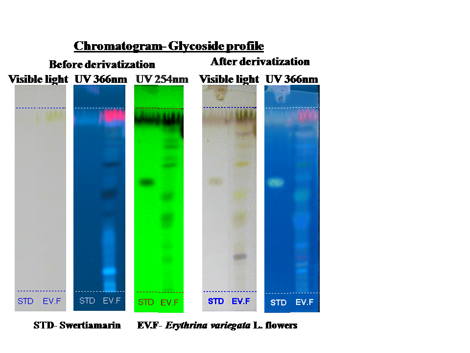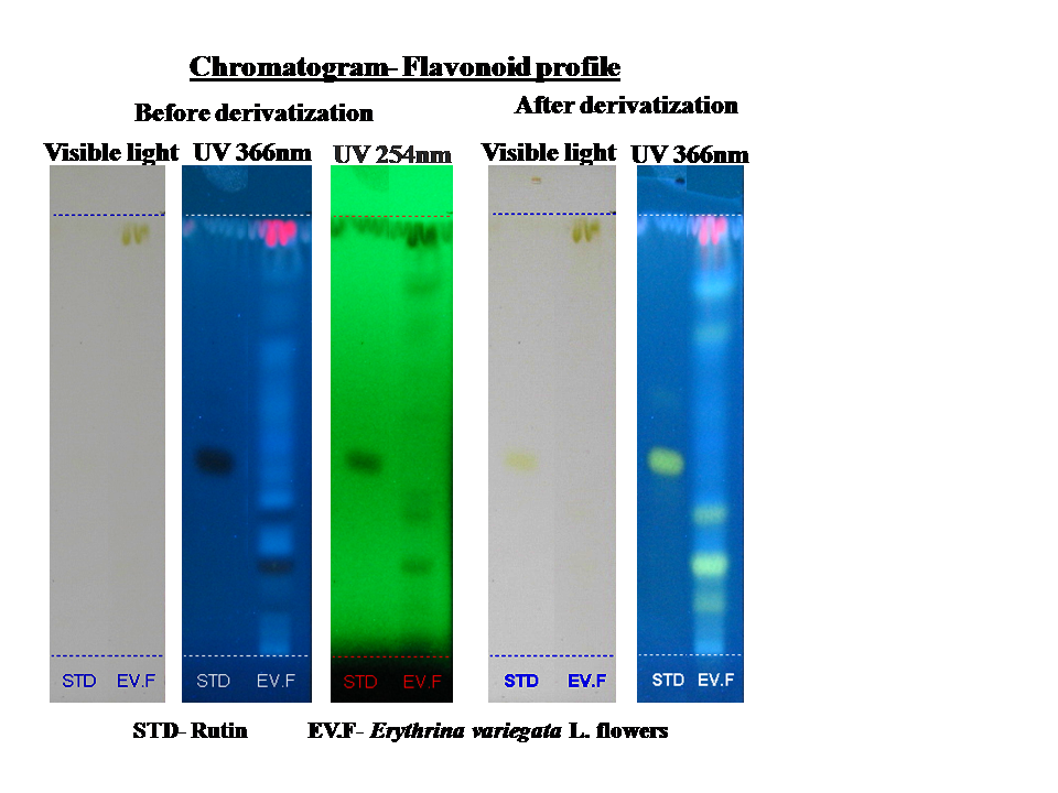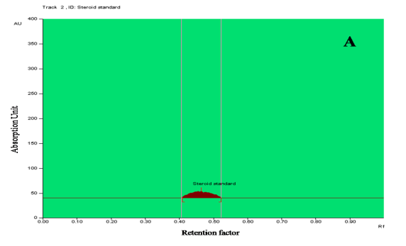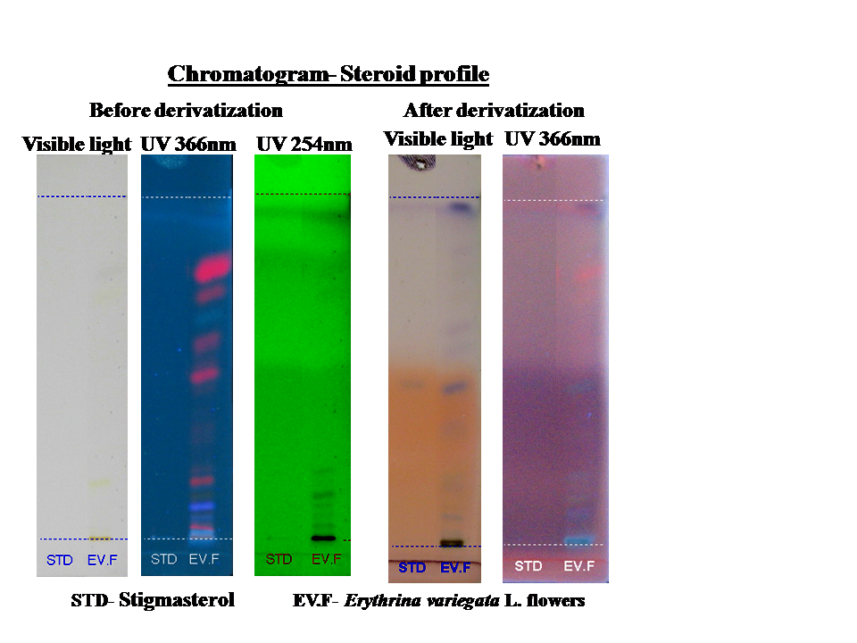 The chromatogram of an ethanolic extract of Erythrina variegata L. flowers shows the presence of five steroid compounds and four unknown compounds with specific Rf values and peak area (table 5). The TLC plate was visualized at 366 nm and 254 nm, before derivatization and 366 nm after derivatization. Blue and bluish violet coloured zones at the visible light mode are present in the sample observed in the chromatogram after derivatization confirmed the presence of steroid in the given samples.