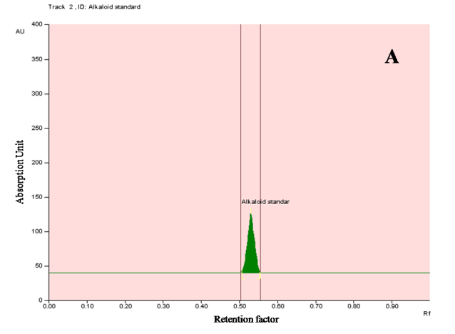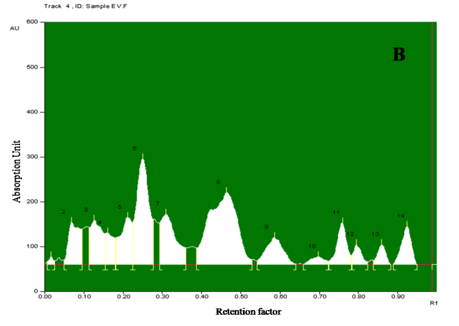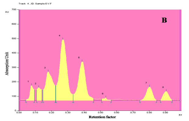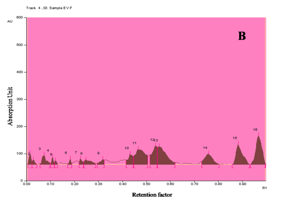 Fig.8:Densitogram and 3D display for saponin profile of ethanolic extract of E. variegata L. and standard. A and B-Densitogram of saponins standard and E. variegata L. flowers, C-3D display of saponins standard and E. variegata L. flowers