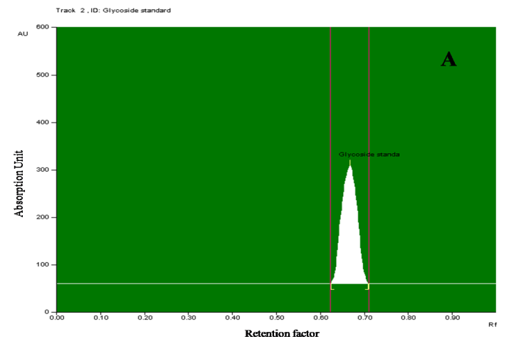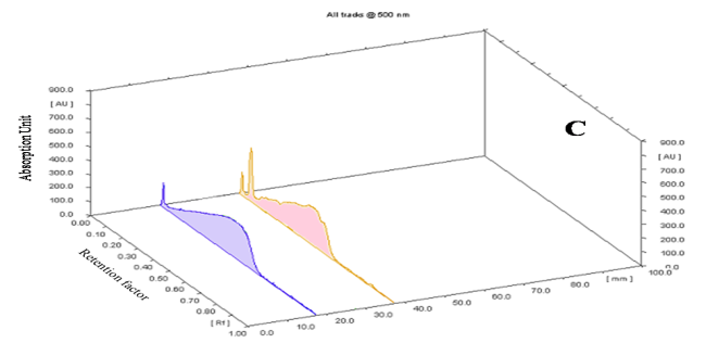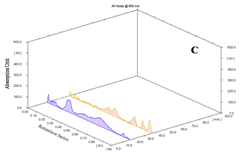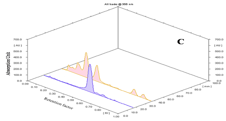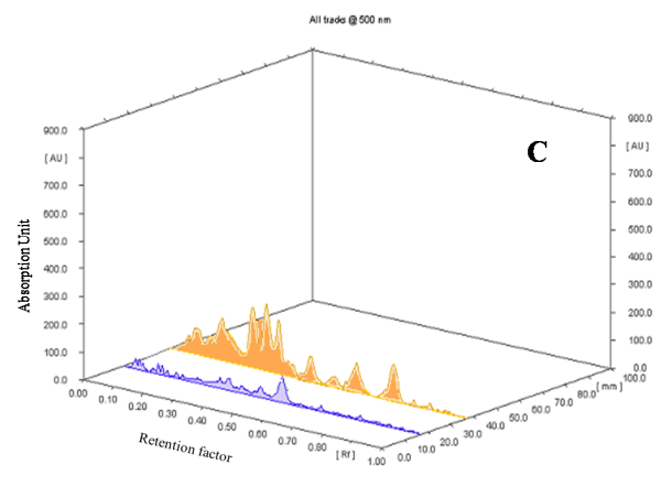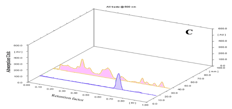 Fig.6:Densitogram and 3D display of glycoside profile of ethanolic extract of E. variegata L. and standard. A and B-Densitogram of glycosides standard and E. variegata L. flowers, C-3D display of glycosides standard and E. variegata L. flowers