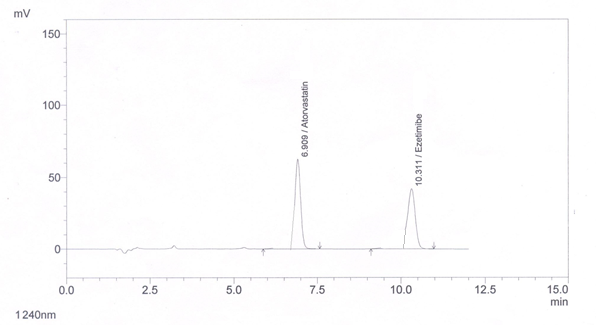 Results: The retention time of drug was found to be 6.91 min. and 10.31 min, respectively. Quantification of the drug was achieved with UV detection at 240 nm. Linear calibration curve was obtained in concentration range 2–12 µg/ml for both drugs, with r2value of 0.9992 and 0.9990. The limit of detection and limit of quantification were found to be 0.81 µg/ml and 2.47 µg/ml respectively for Atorvastatin calcium and 0.76 µg/ml and 2.31 µg/ml respectively for Ezetimibe.