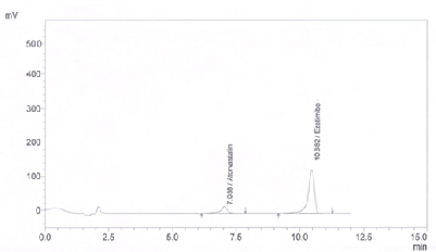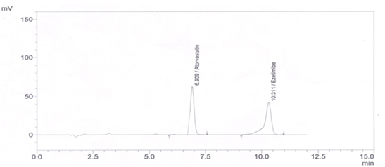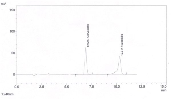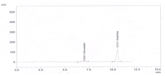 Accurately weighed 10 mg Ezetimibe was transferred to 100 ml volumetric flask dissolved in methanol and add distilled water and sonicate up to 10 minutes. The volume was adjusted to the mark to give final strength i. e 100µg/ml. A standard typical chromatogram of Atorvastatin Calcium and Ezetimibe (fig. 2).