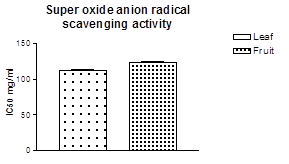 Superoxide anion radical scavenging activity of the plant extracts has been presented in Fig.1. The IC50 value of ethanolic leaf and fruit extracts of AC were 111.67 and 123.89 mg/ml, respectively. The results showed that leaf extract of AC inhibited NBT reduction more significantly than fruit extract.